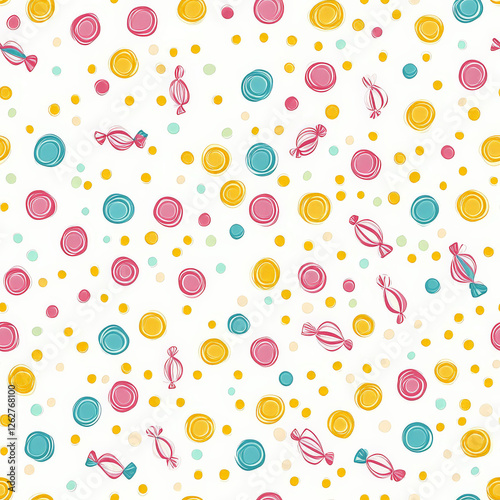 A candy-themed dot pattern, where each dot looks like a tiny wrapped candy in bright pastel shades