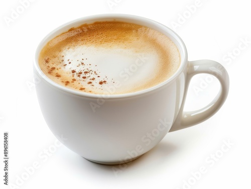 A cappuccino with latte art in a white cup on a white background