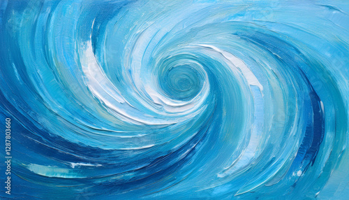 A captivating abstract painting depicts a swirling vortex of blue and white hues, rendered with visible brushstrokes, creating a dynamic and textured representation of motion and depth.
