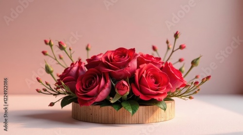 A captivating arrangement of crimson roses nestled in a minimalist wooden bowl, showcasing the delicate beauty of nature's artistry.