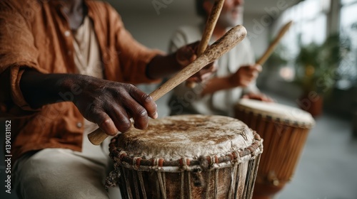 A captivating capture of two musicians skillfully playing djembe drums, exploring the rich cultural tradition of percussion while fostering a sense of community and emotional bond.