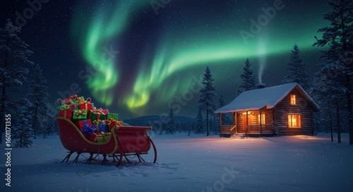 A captivating christmas landscape with a gift-laden sleigh under the aurora borealis and a cozy