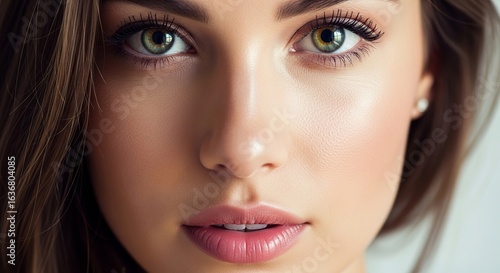 A captivating close-up beauty portrait of a gorgeous young woman with striking green eyes and luscious lips, highlighting her flawless skin and natural makeup. A concept for cosmetology and skincare.