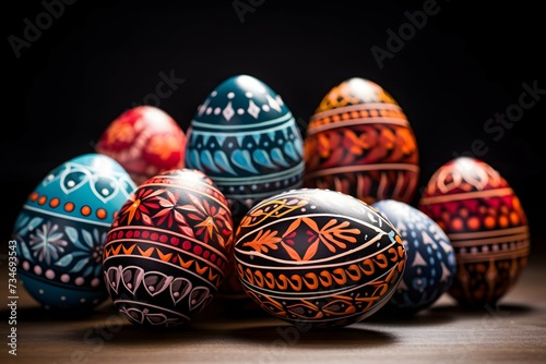 A captivating collection of hand-painted Easter eggs with intricate designs and vibrant colors against a dark background