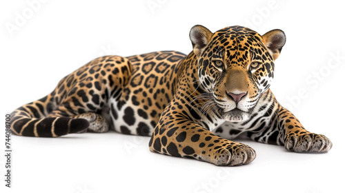 A captivating image of a jaguar in a relaxed position, showcasing its powerful build and intricate spots against a white background