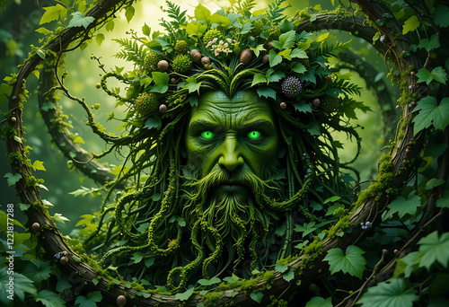 deity, fantasy, green, lush, vibrant, foliage, vine, leaf, mystical, aethereal, green eye, ancient, wood, flora, fauna, jungle, forest, tree, nature, environment, spiritual, magical, art, digital artwork, closeup, portrait, fantasy art, environmentally friendly, sustainable, spring, summer, autumn, environmental conservation, druid, green background, detailed, artistic, mythology