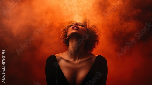 A captivating image of a woman surrounded by rich orange smoke, symbolizing grace and introspection, presenting a moment of serenity and emotional depth in an artistic setting.