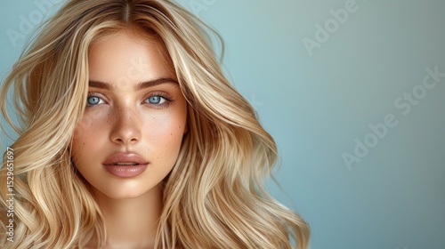 A captivating portrait of a young woman with flowing hair and striking features, exemplifying beauty and confidence with a soft, artistic backdrop that enhances her charm.