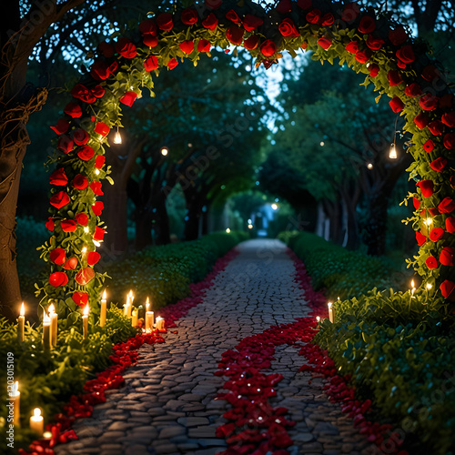 A captivating red rose petal-covered pathway gently leading to a glowing heart-shaped