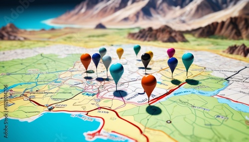 A captivating scene of discovering locations with map pins, inviting exploration of new places and adventures in an engaging digital landscape, Generative AI