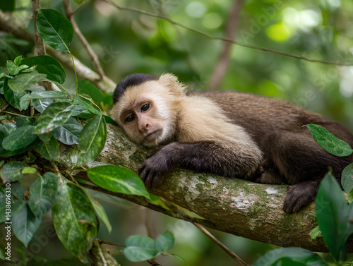 A Capuchin Monkey lying on a branch, lazily observing its surroundings in the dense jungle.