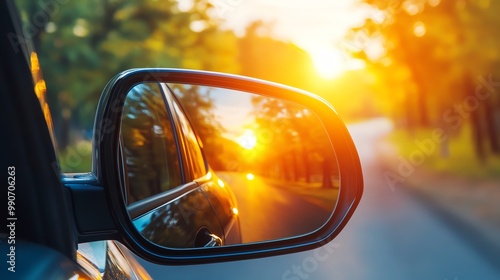 A car driving on a road, sunset is reflected in the rear view mirror.