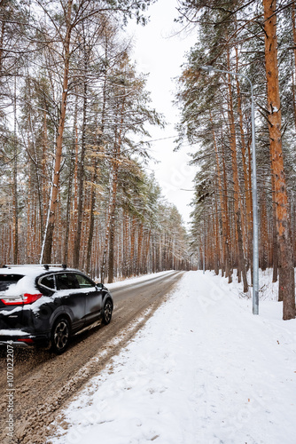 A car is driving down a snowy road in the woods