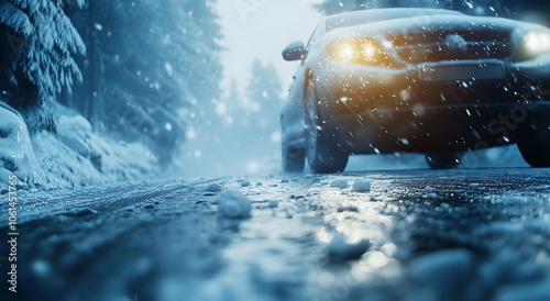 A car is driving on an icy road in the evening, Generative AI