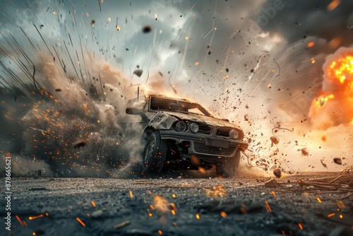 A car is elevated in the air with flames bursting out of it, showcasing a moment of intense danger, Capture a moment of destruction being prevented by insurance coverage