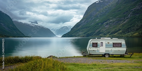 A caravan stands on the grass near a lake in the mountains, with cloudy weather building in the background. Family vacation and adventure holiday concept.