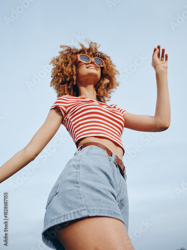 woman, girl, model, person, portrait, lifestyle, fashion, style, casual attire, summer, sun, sunlight, sky, outdoors, denim, short, crop, top, striped, red, white, sunglasses, eyewear, hair, curl, afro, natural, beauty, confidence, cheerful, playful, energy, movement, pose, stance, frame, candid, expression, happiness, mood, atmosphere, relaxed, carefree, vibe, sunshine, breeze, authentic