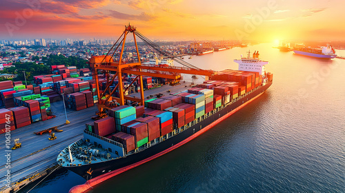 A cargo ship loading containers at a port during sunset, highlighting industrial transport. AI Image