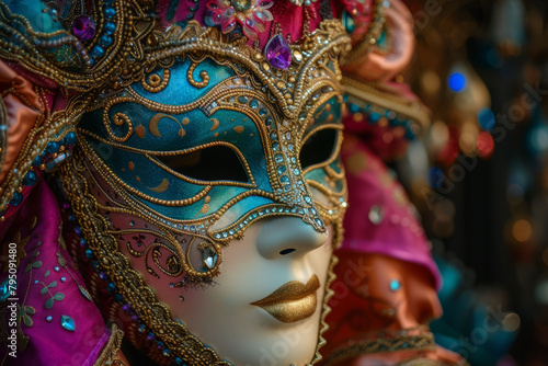A carnival mask adorned with elaborate gemstones and glittering embellishments, captured in soft, diffused lighting to accentuate its luxurious textures and vibrant hues.