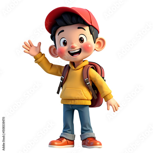 A cartoon boy with a red cap yellow hoodie and backpack waving on a black background illustration isolated on transparent background