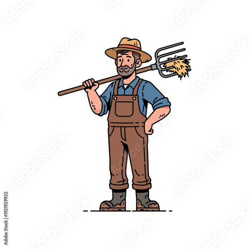 A cartoon farmer stands proudly holding a pitchfork with hay on a white background.