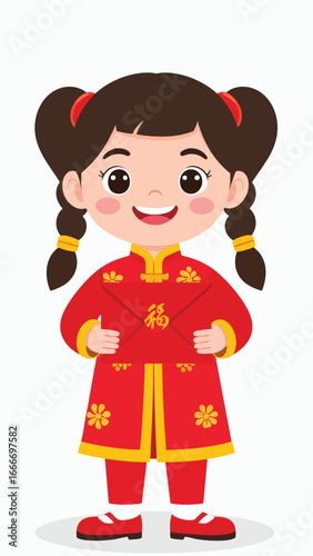 girl, cartoon, children, children, female, braid, hair, brown, eye, smile, happy, cheerful, joy, festive, celebration, holiday, oriental, traditional, clothing, costume, dress, red, gold, yellow, envelope, gift, present, money, luck, fortune, prosperity, symbol, character, chinese, asian, culture, lunar, new, year, spring, festival, occasion, event, design, graphic, illustration, art, vector