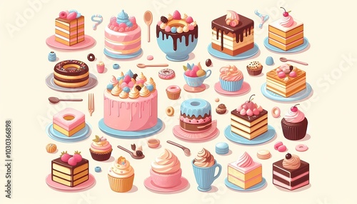 cartoon, cake, cake, colourful, illustration, playful, fun, vibrant, whimsical, celebration, assortment, cupcake, sprinkle, icing, cherry, tier, decoration, variety, favor, sweet, dessert, food, party, design, cheerful, exaggerated, bright, happy, creative, joyful, festive, charming, cute, bakery, sugar, frosting, character, pastry, indulgence, adorable, delicious, inviting, artistic, animated, lively