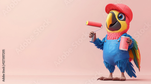 A cartoon parrot wearing a red cap and blue overalls, holding a paint roller and a can of paint, symbolizing creativity, fun, and a playful approach to home improvement or painting projects.