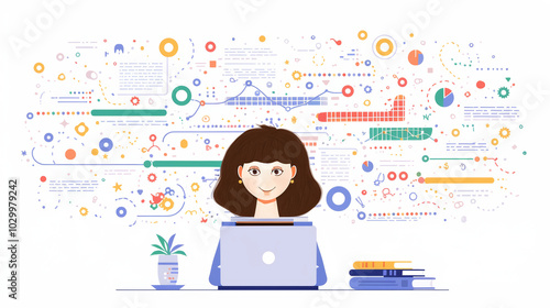 woman, laptop, cartoon, datum, digital, colourful, modern, analysis, interaction, vibrant, visual, technology, innovation, creativity, learning, sharpened, dynamic, information, multimedia, network, future, abstract, design, connectivity, progress, communication, business, study, statistic, illustration, strategy, computer, chart, diagram, workspace, artistic, lively, cognition