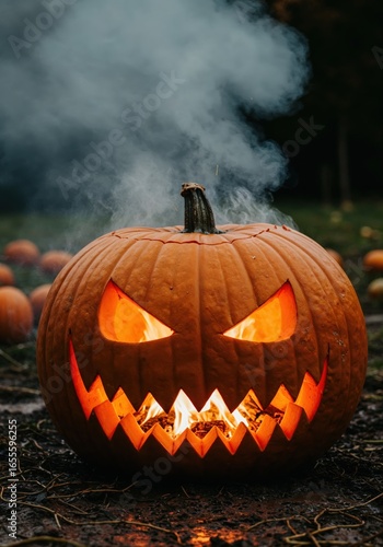 A carved halloween pumpkin with a scary face, glowing with fire and emitting smoke on a dark autumn night