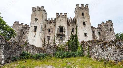 A castle ruins with crumbling walls, overgrown with vines, and the remains of a once-great kingdom