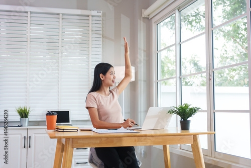 A casually dressed Asian businesswoman works from home while meeting online with a client, looking relaxed, focused and professional despite the informal setting.