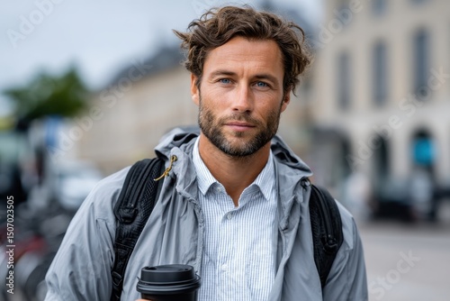 A casually dressed man carrying a coffee cup stands on a city street, blending urban life with a relaxed style, emphasizing the balance of daily routines and modernity.
