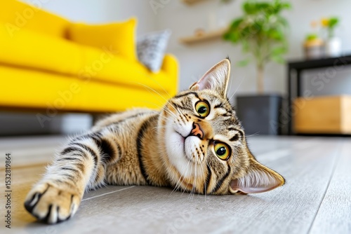 cat, laying, floor, looking, up, camera, kitten, felino, pet, domestic, indoor, living, room, furniture, couch, carpet, eye, paw, stare, stretch, tabby, wood, yellow, green, lying, wooden, closeup, head, tilted, upwards, wide, open, body, out, front, resting, ground, fur, striped, black, brown, ear, background, sofa, plant, shelf, playful, curious