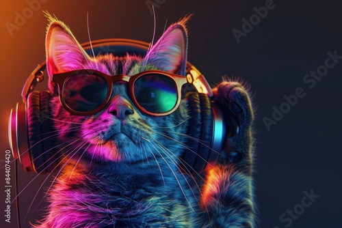 A cat wearing headphones and sunglasses, enjoying music or relaxing in the sun