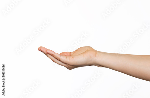 A caucasian female hand makes a gesture like holding something or asking for help isolated on a white background. Mockup with empty copy space for a intended object located on the palm of hand