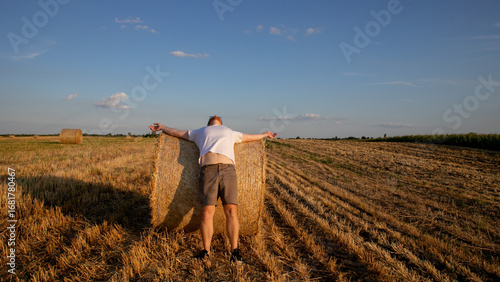caucasian, man, scarecrow, stretch, twilight, hay bale, harvest, festival, surreal, agriculture, rural, pose, vibrant, autumn, landscape