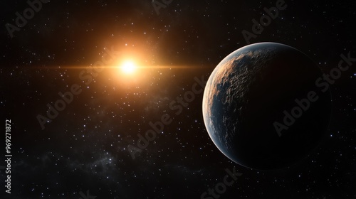 A celestial scene featuring a planet and a bright sun in the vastness of space.