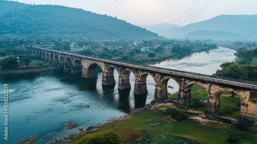A centuries-old bridge with intricate carvings spanning across a scenic river.