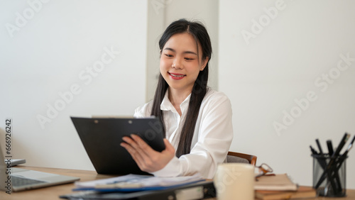 asian, businesswoman, office, business, working, portrait, entrepreneur, confidence, female, manager, modern, desk, young adult, smiling, analysing, employee, finance, marketing, planning, strategy, beautiful, attractive, boss, company, workplace, happy, reading, reviewing, examining, thinking, idea, professional, report, paperwork, paper, document, sheet, project, analysing, clipboard, checking