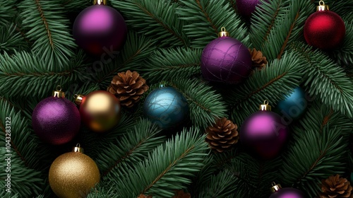 A charming assortment of purple and gold Christmas ornaments set against green pine provides a vibrant depiction of the festive holiday spirit.