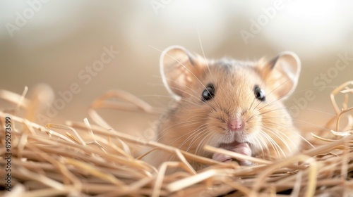A charming close-up image of a hamster with big eyes and clasped hands, sitting in the middle of straw. The backdrop gives a natural, rustic feel expressing innocence.