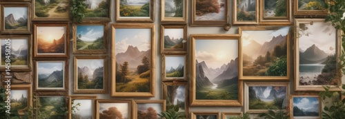A charming collage of diverse photo frames, showcasing nature scenes and abstract art prints , rustic, home decor, simple