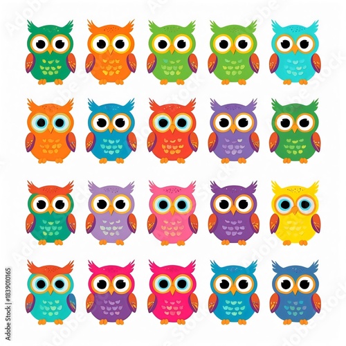 A charming collection of vibrantly colored owl illustrations, each showcasing a unique pattern and personality, grouped together.