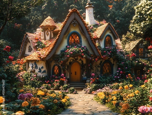 A charming cottage nestled in a lush garden with colorful flowers and a stone pathway leading to the front door.