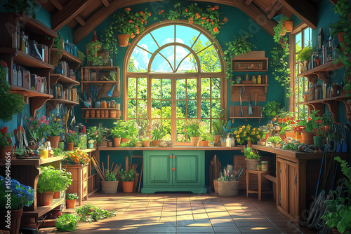 charming, depiction, garden, shed, filled, tool, gardening, supply, background, copy, space, cosy, decor, floral, flower, green, home, interior, plant, pot, rustic, shelf, still, life, sunlight, teal, window, wooden