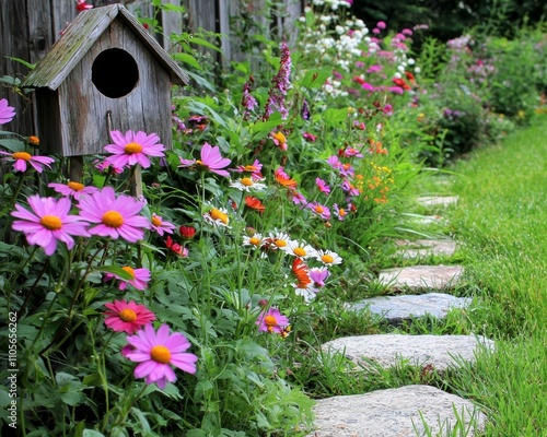 A charming garden path lined with vibrant flowers and a birdhouse, creating a picturesque and inviting outdoor space.