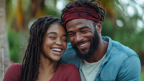 A charming portrait of a couple enjoying each other’s company, exuding joy and affection while surrounded by lush greenery on a sunny day, capturing pure happiness.