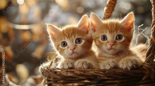 A charming scene of ginger red kittens cuddled up in a basket, with their bright eyes looking out curiously.