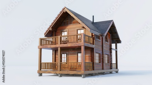 A charming two-story wooden cabin with a balcony, perfect for a cozy retreat.